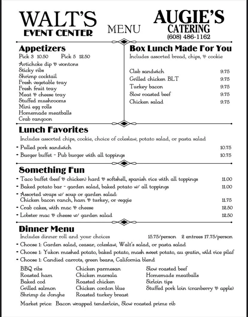Walt’s Event Center in Bangor, WI offers comprehensive services to simplify your event planning—from in-house catering and audio-visual support to setup and teardown. Let us bring your vision to life.